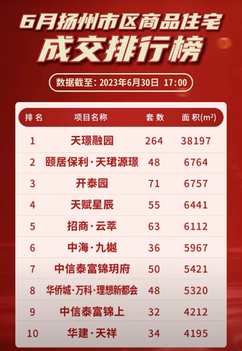 天璟融園項目自2023年6月2日首開入市銷售以來,一直備受揚州房產(chǎn)市場關(guān)注,不僅成為2023年揚州樓市第一個搖號樓盤,當(dāng)月更是以成交備案264套的成績榮登揚州市區(qū)商品住宅成交排行榜首位(數(shù)據(jù)來源自揚州房地產(chǎn)信息網(wǎng)項目備案數(shù)據(jù))。
