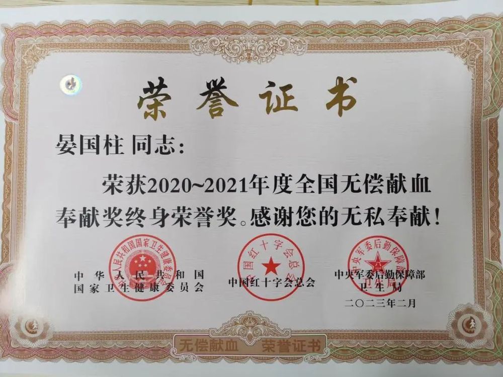 點(diǎn)滴熱血,“輸”寫大愛。日前,供熱公司“暖揚(yáng)”服務(wù)隊(duì)隊(duì)長晏國柱同志被國家衛(wèi)生健康委、中國紅十字總會(huì)、中央軍委后勤保障部衛(wèi)生局聯(lián)合授予“無償獻(xiàn)血奉獻(xiàn)獎(jiǎng)終身榮譽(yù)獎(jiǎng)”。