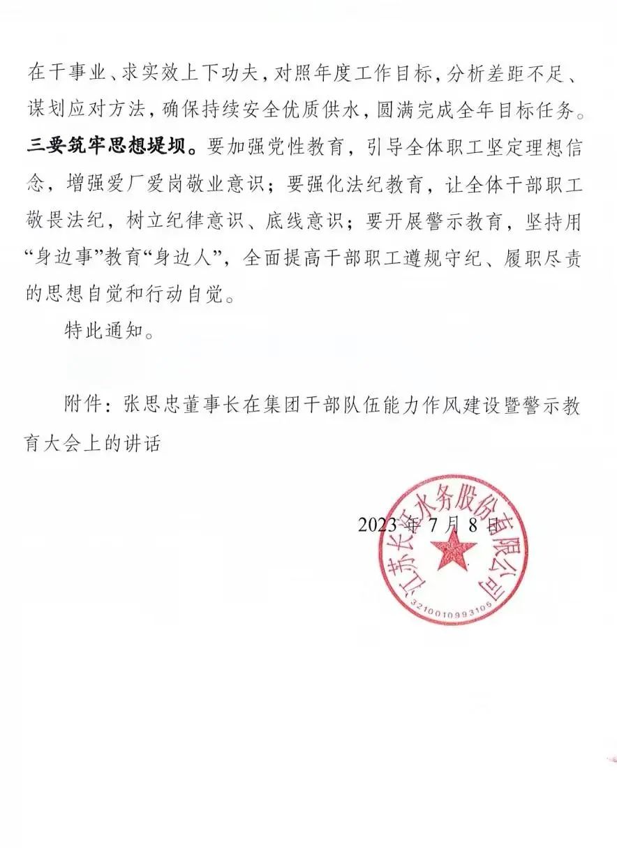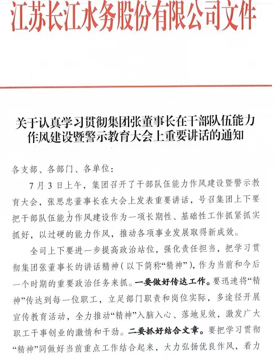 城控集團(tuán)召開干部隊(duì)伍能力作風(fēng)建設(shè)暨警示教育大會(huì)后,長(zhǎng)江水務(wù)迅速傳達(dá)學(xué)習(xí)貫徹會(huì)議精神和張思忠董事長(zhǎng)講話精神,將會(huì)議內(nèi)容和講話精神與工作實(shí)際結(jié)合,以學(xué)促干,以干踐學(xué),以安全優(yōu)質(zhì)保供為己任,保障全市夏季高峰供水。全體長(zhǎng)江水務(wù)人大干火熱七月,力爭(zhēng)交出優(yōu)異成績(jī)單,為完成三季度乃至全年工作打下堅(jiān)實(shí)基礎(chǔ)。