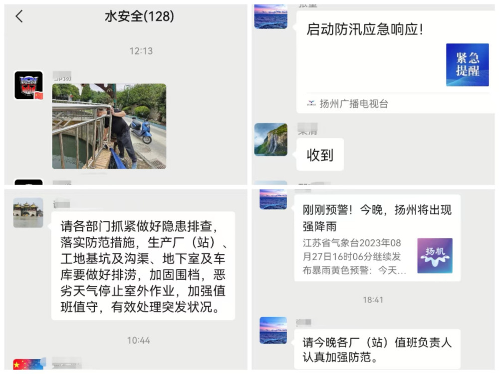 長江水務公司主要負責人和分管負責人連續(xù)在“中層管理”“水安全”微信工作群內(nèi)發(fā)布暴雨預警,提醒加強防范,強化調(diào)度指令,層層落實安全生產(chǎn)責任。長江水務公司各生產(chǎn)、服務、搶修和施工部門啟動應急預案,備足備齊防汛物資,24小時保持人員在崗值守,及時上報所在區(qū)域的雨情、汛情和應急處置的措施。