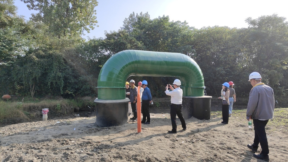 三期四標管道設計DN600主管從三期三標段接出,沿廖家溝河堤西外側向北敷設至廣陵大橋,與已建二期管線預留口連接,全長約2206米。其中,過328國道頂管部分為三期四標施工關鍵節(jié)點,長約199米,兩座沉井分別位于328國道南、北兩側,施工工藝復雜,精度控制要求高。公司項目組堅持問題導向,聚焦項目推進中存在的難點,強化要素保障,積極協(xié)調解決,以優(yōu)質的施工工藝、嚴格的質量把控、科學的施工方案,確保了頂管施工的安全可控、精準對位。