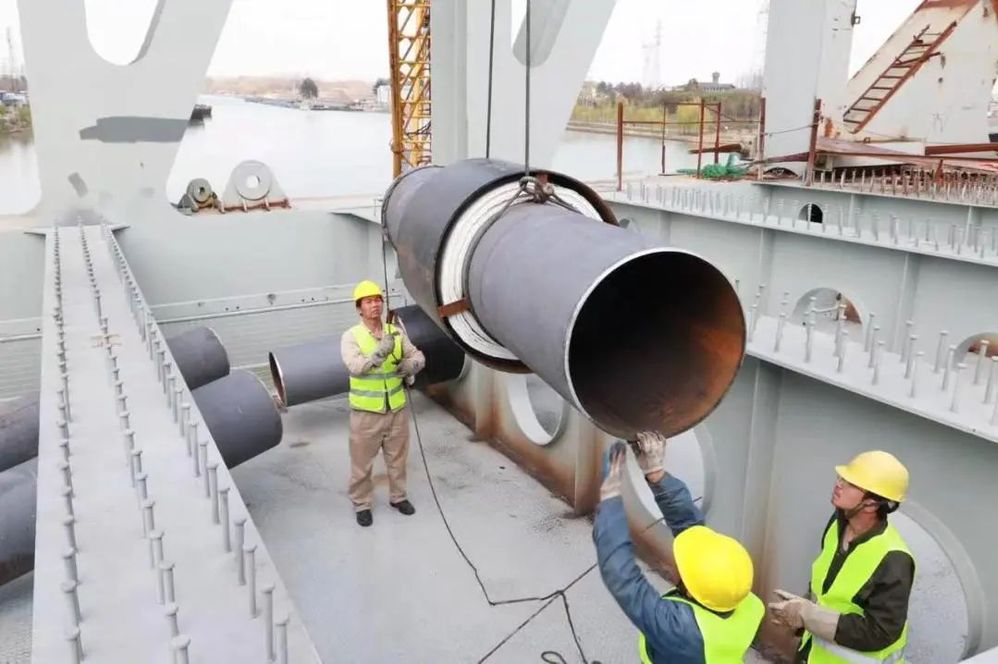 本次創(chuàng)新方案來源于市級重大項目揚州市東南主干線熱網(wǎng)工程,其中廣陵大橋隨橋段是該工程的一個關(guān)鍵節(jié)點。橋梁總體呈弧型且橋面起拱變化大,管道軸線位于南側(cè)橋翼邊緣內(nèi)側(cè),對安裝的角度和精度的要求較高,傳統(tǒng)的吊裝方式難以滿足該項目施工要求。公司隨即組織勞模創(chuàng)新團隊進行技術(shù)攻關(guān),經(jīng)過反復的實地查看和研討磋商,并廣泛征集了工程設(shè)計單位和施工單位的意見,設(shè)計出一種“倒F”型吊架,成功解決了大重量、大管徑管道橋翼內(nèi)側(cè)吊裝的問題,有效減少了成本、縮短了工期,同時大大提高了施工的安全性和可靠性。對于類似工況下的大重量、大管徑管道隨橋敷設(shè)具有借鑒和推廣價值。