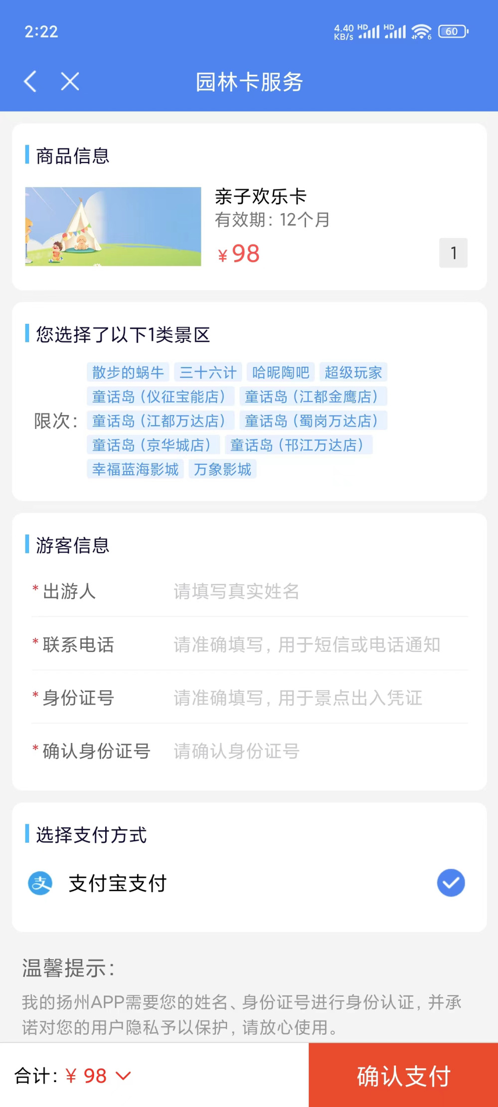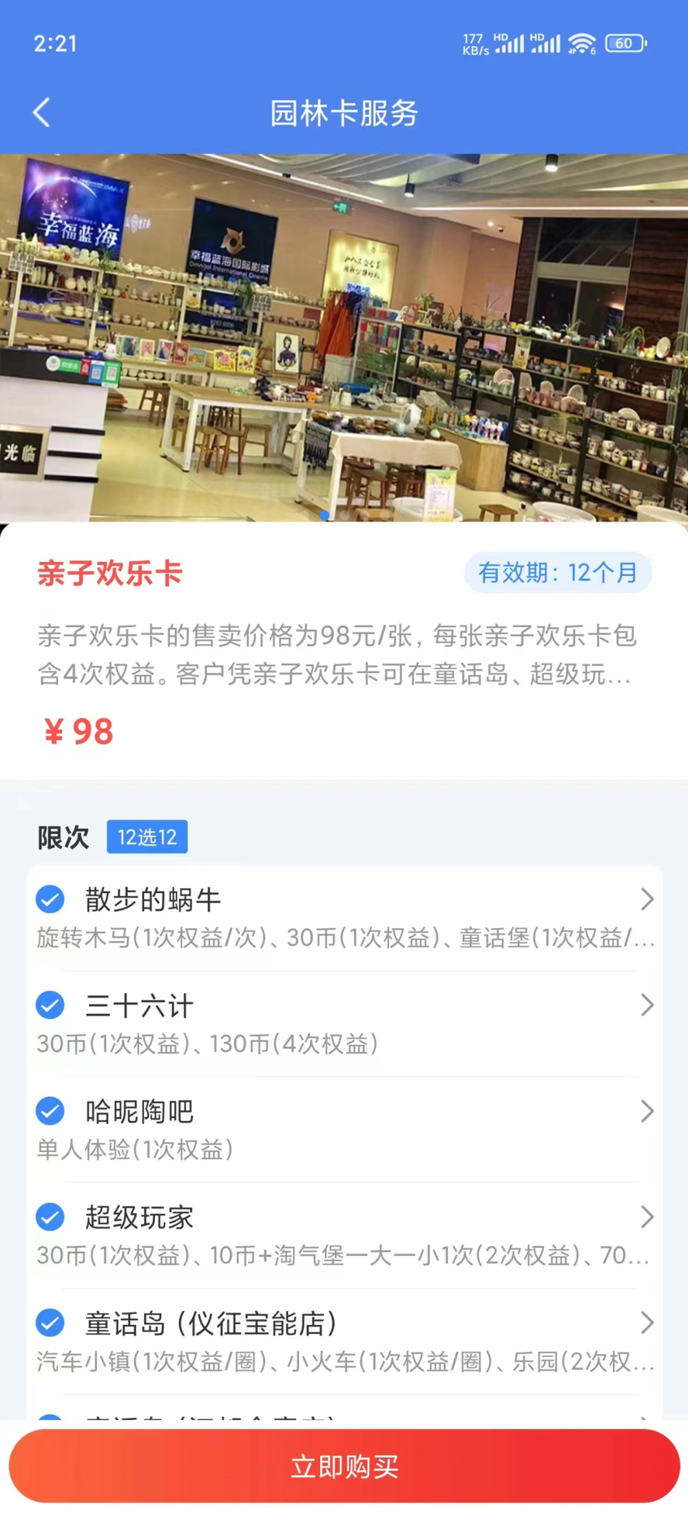 親子歡樂卡的售賣價(jià)格為98元/張,每張親子歡樂卡包含4次權(quán)益。
