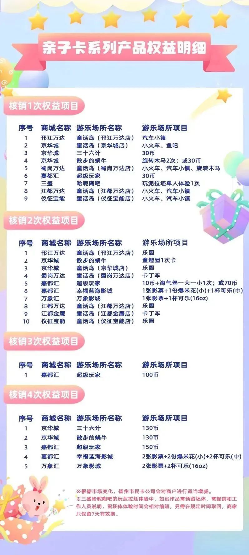 各商戶提供游玩項(xiàng)目,需扣除相應(yīng)的權(quán)益次數(shù)。權(quán)益次數(shù)至購買日起一年內(nèi)有效。