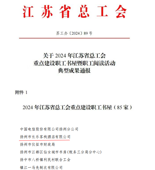 近日,江蘇省總工會(huì)發(fā)布重點(diǎn)建設(shè)職工書屋暨職工閱讀活動(dòng)典型成果通報(bào),揚(yáng)州市長(zhǎng)樂(lè)客棧酒店榮獲“2024年江蘇省總工會(huì)重點(diǎn)建設(shè)職工書屋”稱號(hào)。