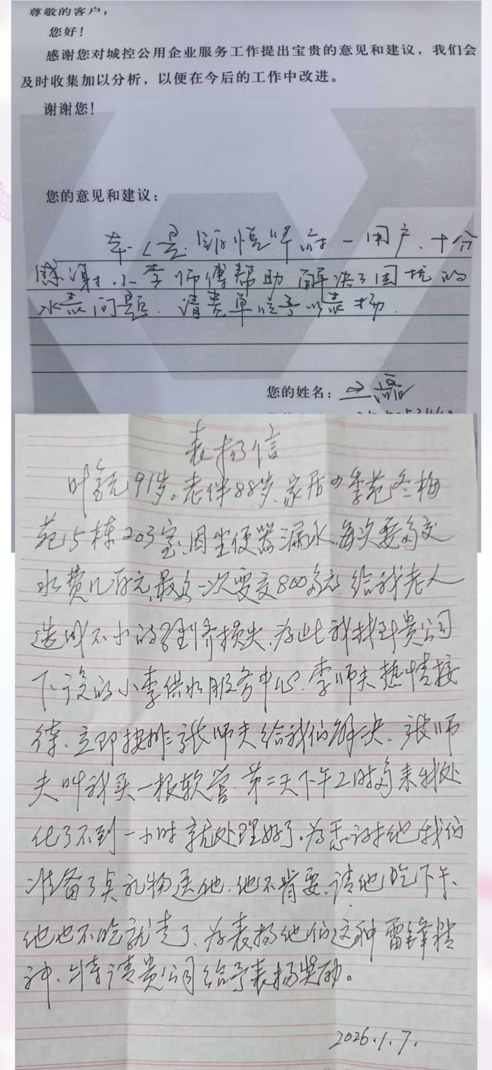 2025年12月10日下午及2026年1月7日,長江水務(wù)小李服務(wù)隊(duì)隊(duì)長李青同志及隊(duì)員,在文匯東路服務(wù)大廳先后收到兩位用戶的高度贊揚(yáng)。用戶對服務(wù)隊(duì)專業(yè)高效、熱情周到的服務(wù)給予了誠摯肯定。