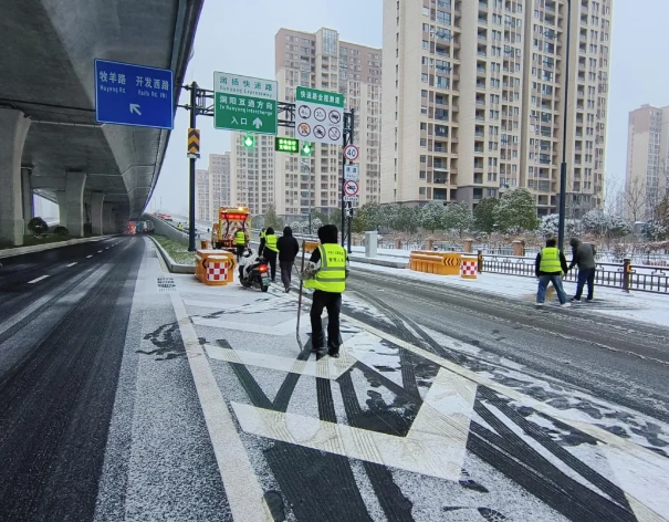 萬福公司在潤揚快速路現(xiàn)場共投入應急人員50余人,調配鏟車2臺及其他除雪物資若干,按照“機械為主、人工為輔、先急后緩”原則,有序對轉彎車道、上下匝道等重點區(qū)域進行積雪清理,并同步實施防凍防滑處理。截至20日上午8時,地面輔路(含藍山莊園集散車道段)已全面開放交通,高架水馬等臨時設施也已全部撤離。
