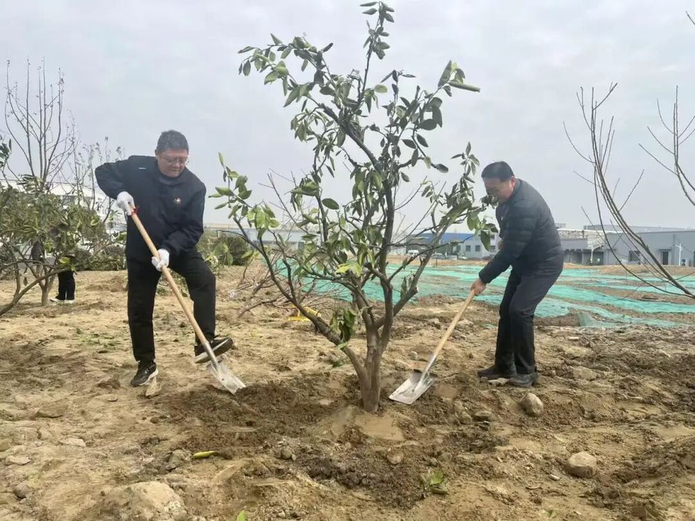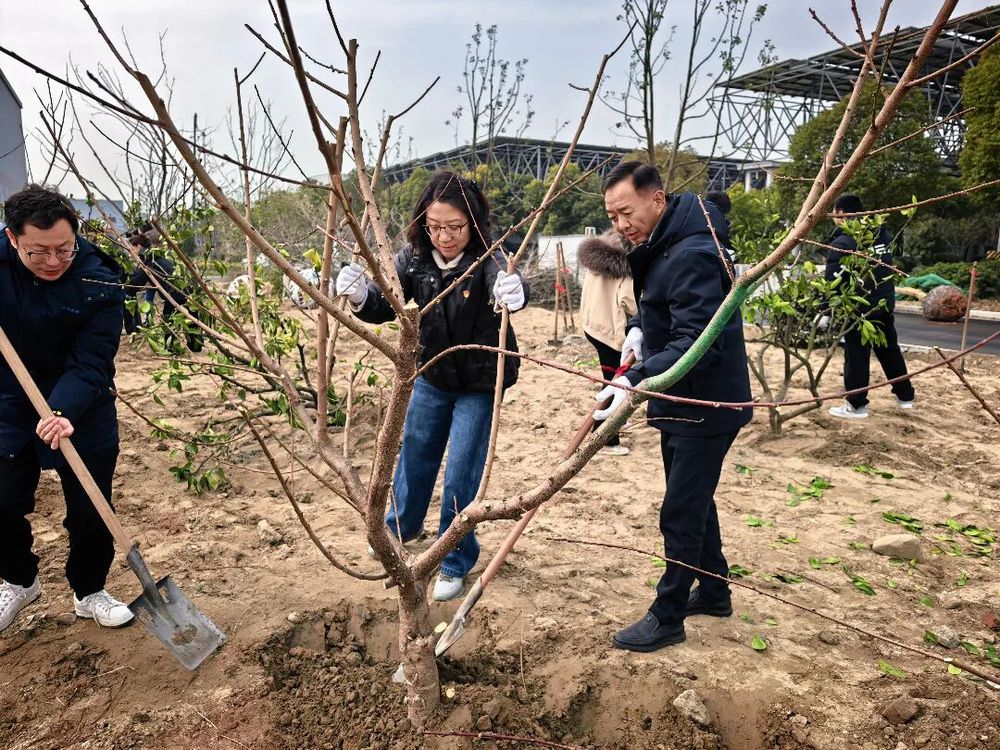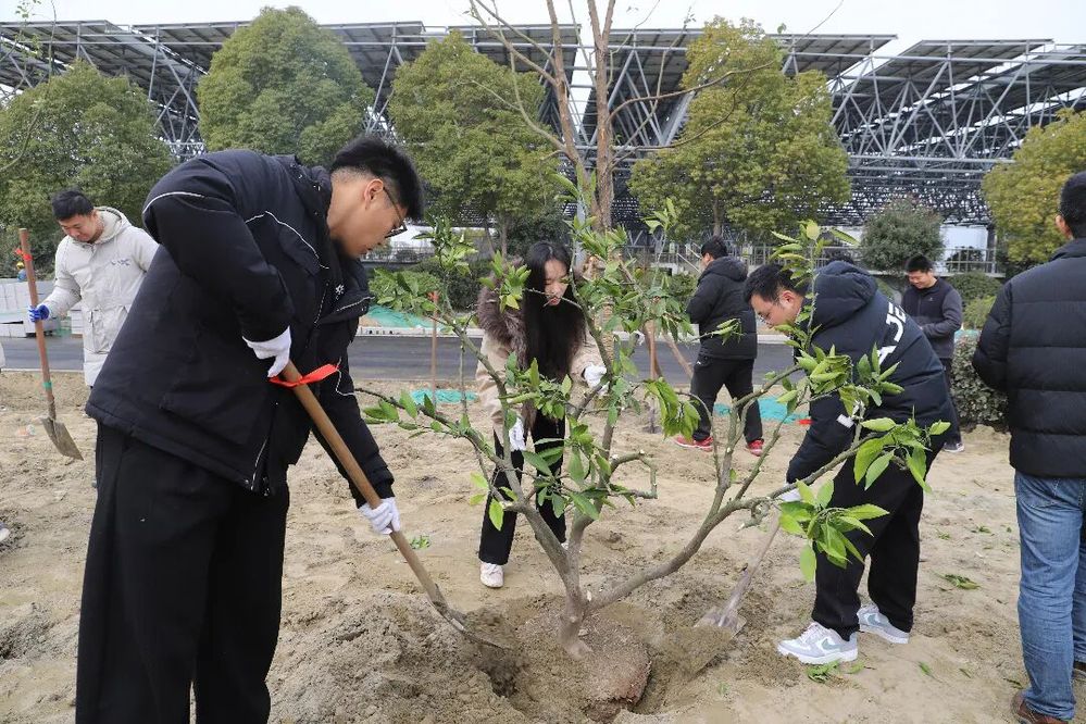 隨后,工作人員詳細(xì)講解了苗木種植要點、現(xiàn)場安全注意事項及分組安排,在領(lǐng)取鐵鍬、水桶、手套等工具后,大家迅速投入植樹作業(yè),扶苗、填土、壓實、澆水,每一個環(huán)節(jié)大家都配合默契、一絲不茍,保證每一棵桃樹苗都能規(guī)范栽種、落地生根,36棵苗木很快在六圩污水處理廠的土地上整齊挺立,為廠區(qū)增添了一抹盎然春意。