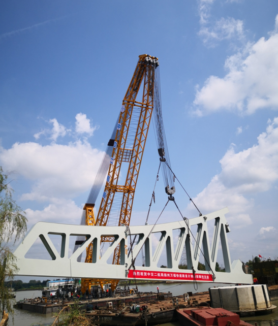 9月26日下午,萬(wàn)??焖俾房缇┖歼\(yùn)河大橋首片鋼桁架吊裝成功,打響了大橋上部結(jié)構(gòu)施工的第一槍。