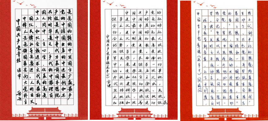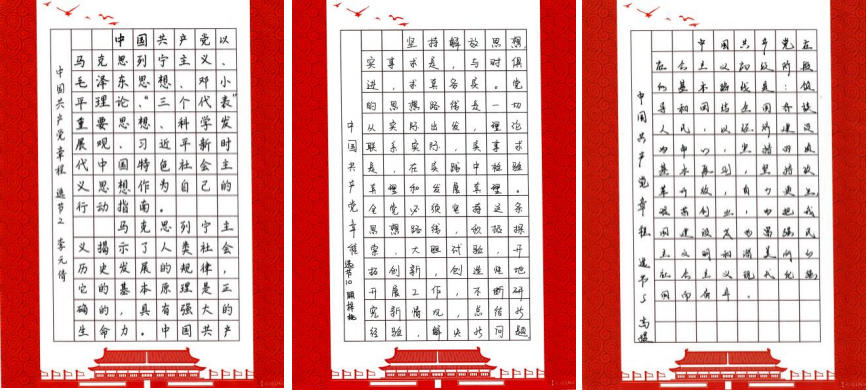 文字入手、意識入腦、責(zé)任入心。支部黨員利用工作之余,以《中國共產(chǎn)黨章程(修正案)》為藍本,堅持一筆一畫工整書寫黨章,一字一句銘記黨章條款,熟悉掌握黨章主要內(nèi)容,深入領(lǐng)會黨章內(nèi)涵、精神實質(zhì)以及對共產(chǎn)黨員的職責(zé)要求。全體黨員抄黨章、學(xué)黨章、悟黨章,內(nèi)外一心,共同在抄寫中提升黨性,鑄造黨魂。