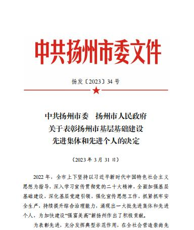 近日,揚(yáng)州市委、市政府發(fā)布《關(guān)于表彰揚(yáng)州市基層基礎(chǔ)建設(shè)先進(jìn)集體和先進(jìn)個(gè)人的決定》,表彰了過去一年在“強(qiáng)富美高”新?lián)P州建設(shè)中,在加強(qiáng)基層基礎(chǔ)建設(shè)、深化基層黨建引領(lǐng)、強(qiáng)化宣傳思想工作、抓緊抓牢安全生產(chǎn)、持續(xù)提升綜合治理能力等多個(gè)方面涌現(xiàn)出的一批銳意進(jìn)取、改革創(chuàng)新、勇于擔(dān)當(dāng)、善于作為的先進(jìn)集體和先進(jìn)個(gè)人。