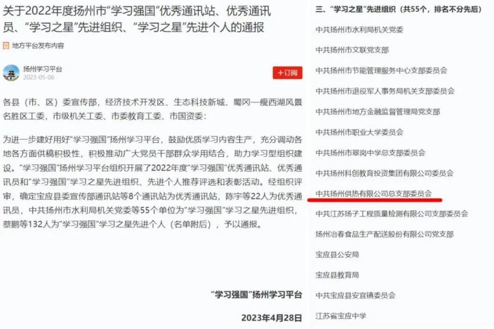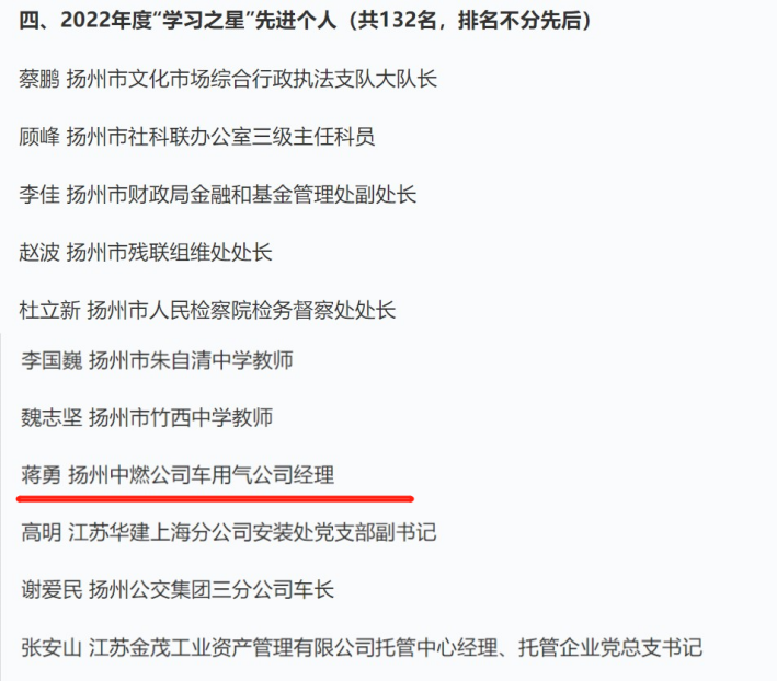 近日,“學(xué)習(xí)強(qiáng)國”揚(yáng)州學(xué)習(xí)平臺(tái)發(fā)布了《關(guān)于2022年度揚(yáng)州市“學(xué)習(xí)強(qiáng)國”優(yōu)秀通訊站、優(yōu)秀通訊員、“學(xué)習(xí)之星”先進(jìn)組織、“學(xué)習(xí)之星”先進(jìn)個(gè)人的通報(bào)》,集團(tuán)下屬供熱公司黨總支被表彰為2022年度揚(yáng)州市“學(xué)習(xí)強(qiáng)國”“學(xué)習(xí)之星”先進(jìn)組織、揚(yáng)州中燃公司蔣勇被表彰為“學(xué)習(xí)之星”先進(jìn)個(gè)人榮譽(yù)稱號(hào)。