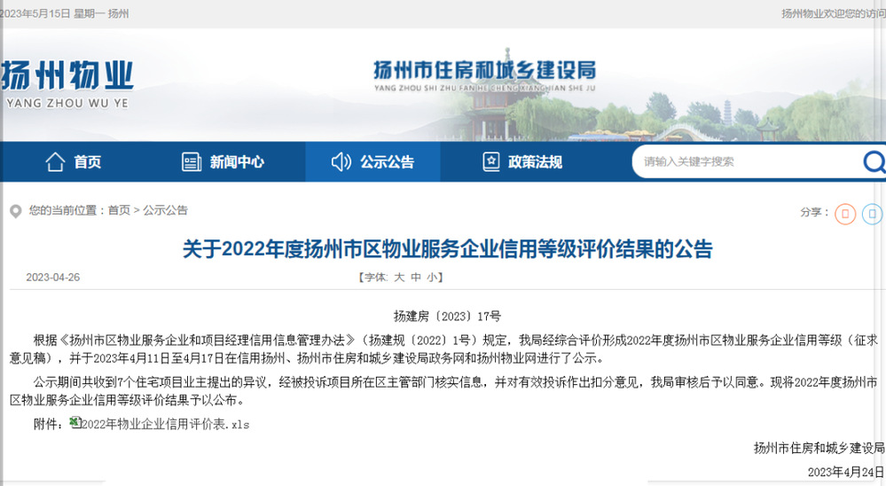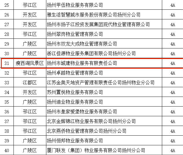 近日,《2022年度揚(yáng)州市區(qū)物業(yè)服務(wù)企業(yè)信用等級(jí)》公布,城建物業(yè)公司再次獲得揚(yáng)州市4A級(jí)物業(yè)服務(wù)企業(yè)信用等級(jí)評(píng)定,連續(xù)3年在所屬蜀岡瘦西湖景區(qū)的11家物業(yè)企業(yè)信用評(píng)級(jí)中蟬聯(lián)第一,也是景區(qū)目前唯一一家AAAA級(jí)物業(yè)服務(wù)單位。