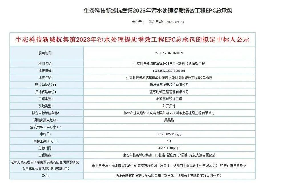 近期,上善公司再次成功中標生態(tài)科技新城杭集鎮(zhèn)污水處理提質(zhì)增效工程,中標金額3017萬元。