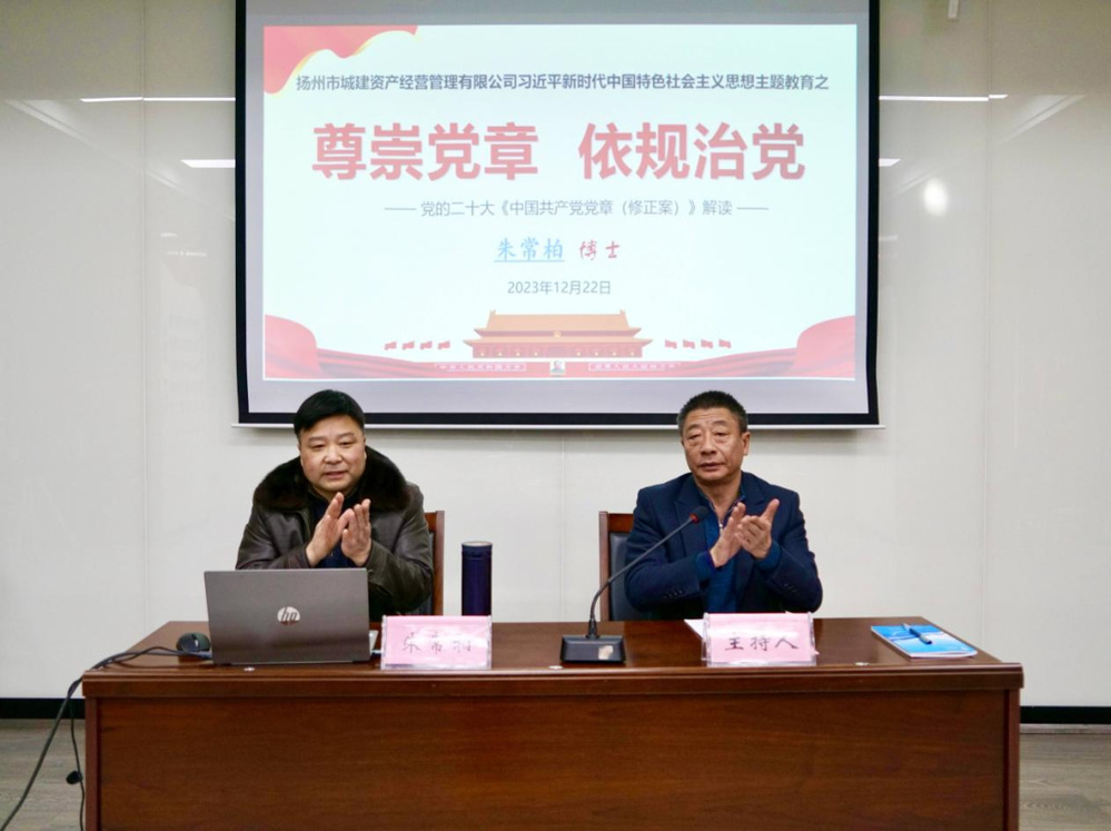揚(yáng)州大學(xué)法學(xué)博士、副教授、碩士生導(dǎo)師朱常柏博士以《尊崇黨章 依規(guī)治黨》為題,為大家進(jìn)行了學(xué)黨章專題輔導(dǎo),并根據(jù)新修訂的《中國(guó)共產(chǎn)黨章程》,對(duì)“黨章的地位與作用”“黨章的結(jié)構(gòu)與內(nèi)容”“黨章修正若干要點(diǎn)”三個(gè)方面作了重點(diǎn)解讀。朱博士講解風(fēng)格生動(dòng)幽默,內(nèi)容結(jié)構(gòu)脈絡(luò)清晰,理論與實(shí)際相聯(lián)系、歷史與現(xiàn)實(shí)相對(duì)照,引導(dǎo)我們要時(shí)刻做到心中有黨、在黨言黨、對(duì)黨忠誠(chéng),進(jìn)一步增強(qiáng)尊崇黨章、遵守黨章、維護(hù)黨章的自覺性和堅(jiān)定性,真正把黨章黨規(guī)內(nèi)化于心、外化于行。