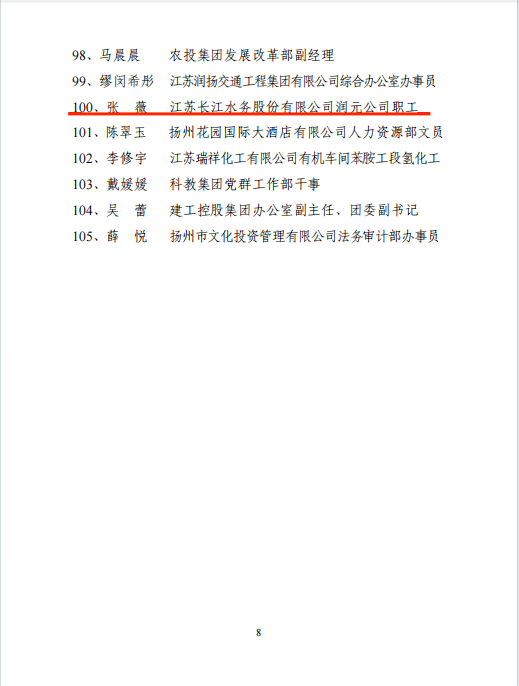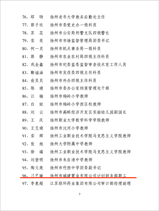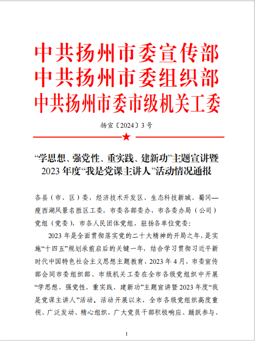近日,市委宣傳部、市委組織部、市級(jí)機(jī)關(guān)工委下發(fā)了《“學(xué)思想、強(qiáng)黨性、重實(shí)踐、建新功”主題宣講暨2023年度“我是黨課主講人”活動(dòng)情況通報(bào)》,城控集團(tuán)選送的2名選手——揚(yáng)州市城建置業(yè)有限公司刁藝璇、江蘇長(zhǎng)江水務(wù)股份有限公司張薇被評(píng)為2023年度揚(yáng)州市“優(yōu)秀黨課主講人”。