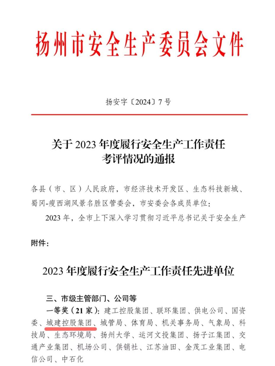 近日,揚(yáng)州市安全生產(chǎn)委員會(huì)發(fā)布了《關(guān)于2023年度履行安全生產(chǎn)工作責(zé)任考評(píng)情況的通報(bào)》,城控集團(tuán)榮獲“2023年度履行安全生產(chǎn)工作責(zé)任先進(jìn)單位”一等獎(jiǎng)。