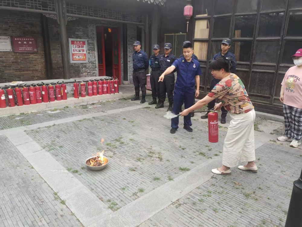 為進(jìn)一步加強(qiáng)已租賃文物建筑火災(zāi)防控能力,增強(qiáng)文物建筑從業(yè)人員消防安全防范意識(shí)和突發(fā)事件應(yīng)變能力,確保文物建筑物的消防安全,6月26日下午,名城公司東關(guān)街經(jīng)營(yíng)管理公司邀請(qǐng)廣陵區(qū)消防大隊(duì)宣傳員,在省級(jí)文保單位冬榮園內(nèi)進(jìn)行了消防安全應(yīng)急演練,街區(qū)安保人員、文保單位從業(yè)人員參加演練。