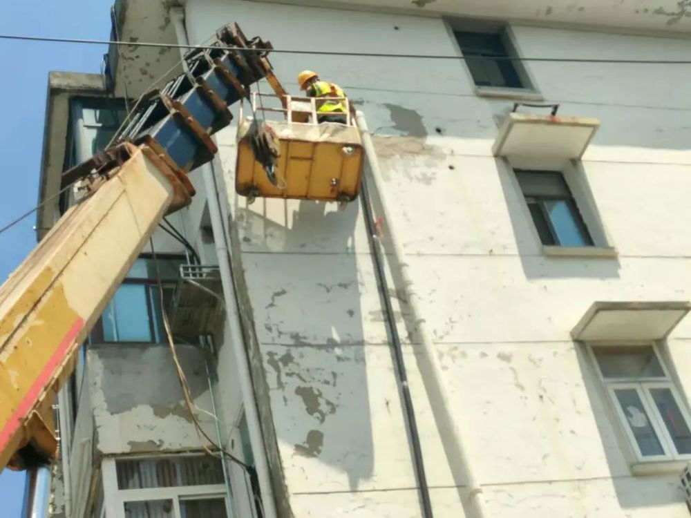 中午12點(diǎn),施工人員頂烈日、冒酷暑,身著安全服裝、頭戴安全帽進(jìn)入現(xiàn)場(chǎng)。漏水的是距離地面約15米左右高度的DN20PE進(jìn)戶(hù)管,由于現(xiàn)場(chǎng)無(wú)法搭腳手架,又調(diào)來(lái)掛籃吊車(chē)進(jìn)行高空作業(yè),在制定好具體方案后實(shí)施搶修。