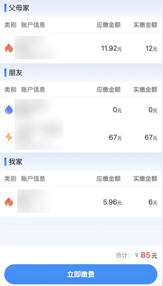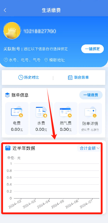 新增繳費戶號后,您可點擊生活繳費右上角一鍵繳費按鈕,此時頁面會顯示當前登錄用戶綁定的所有繳費戶號。(可綁定不會使用智能機的父母家水電氣戶號哦~)