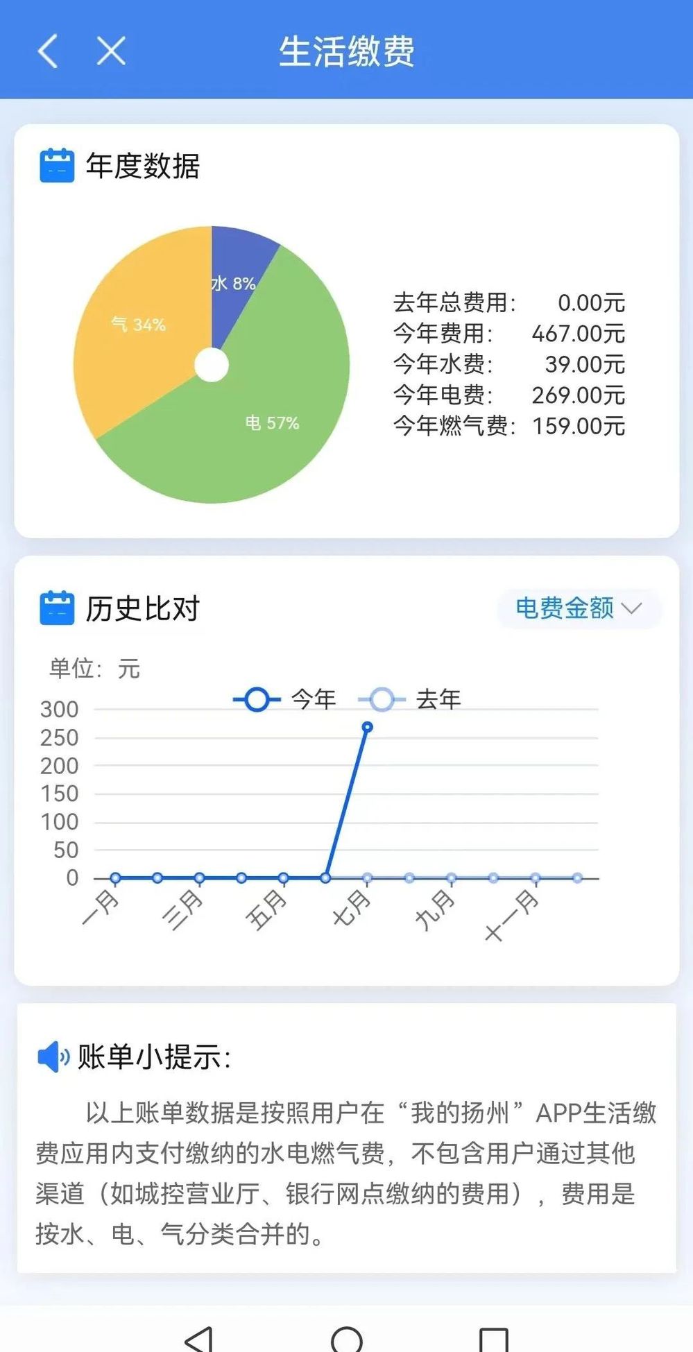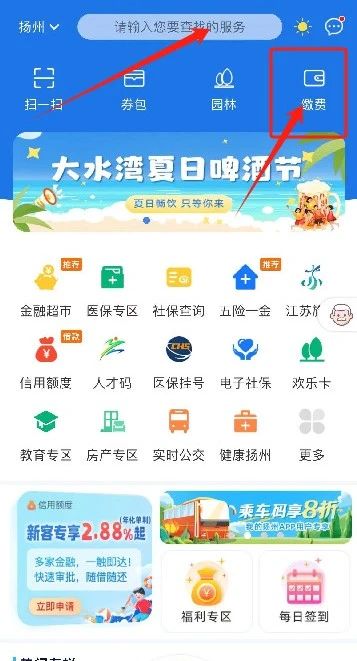 打開我的揚州APP,點擊右上角繳費按鈕或在頂部搜索欄搜索“生活繳費”,進入生活繳費頁面。