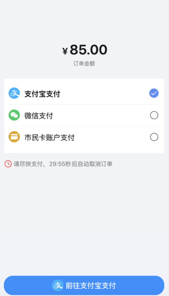 點擊立即繳費按鈕,進入繳費頁面,您可以選擇支付寶/微信/市民卡賬戶進行合并支付或分別支付繳費哦。
