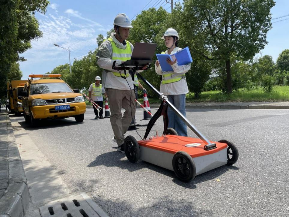 休息片刻,消退些暑熱后,楊帆利用雷達探測設備,給附近路面“拍CT”。不遠處,樹蔭下乘涼的幾位居民好奇地張望,似乎想來湊熱鬧,可又舍不得陰涼。楊帆介紹,由于地下管網(wǎng)錯綜復雜,水流滲漏沖刷泥土會造成地下空洞,給市民出行帶來安全隱患?!拔覀児緦iT引進了先進的雷達探測設備,定期對道路進行‘體檢’,及時消除安全隱患”。楊帆一路走去,后背的道道鹽霜格外醒目。