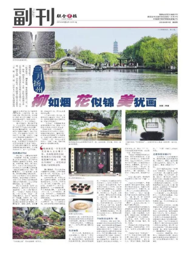 8月15日,新加坡《聯(lián)合早報》“中文副刊”專欄以大幅版面對揚州文旅資源進行了深度報道,內(nèi)容涵蓋瘦西湖、個園、東關(guān)街長樂客棧及揚州早茶文化等多個板塊,引發(fā)海內(nèi)外華人廣泛關(guān)注,截至目前全球媒體轉(zhuǎn)載量達127家次,覆蓋英語、法語、德語、西班牙語、日語、韓語、泰語等多個語種。