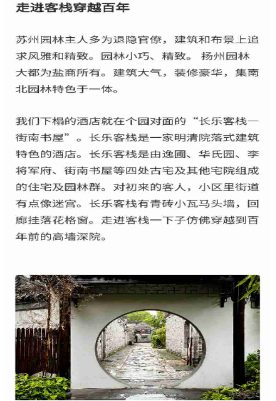 長樂客棧位于中國十大歷史文化名街之一的東關(guān)歷史文化街區(qū),占地3.5萬平方米,建筑面積2萬平方米,現(xiàn)有員工140余人,客房130余間(套),是揚州市首家民居式精品文化酒店。通過對酒店區(qū)域內(nèi)逸圃(民國初年錢業(yè)經(jīng)紀人李鶴生老宅)、街南書屋(馬氏鹽商的住宅)、李長樂故居(清代名將李長樂將軍府)、華氏園(清末民初鹽商華友梅老宅)等名人故居、古建老宅等空間載體的保護修復,在充分體現(xiàn)了揚州園林因地制宜、參差自然、巧于因借、步移景異等藝術(shù)特點的同時,讓古城歷史文化遺跡煥發(fā)出新的生機和活力,成為我市推進古城整體保護、有機更新和活化利用的優(yōu)秀案例。