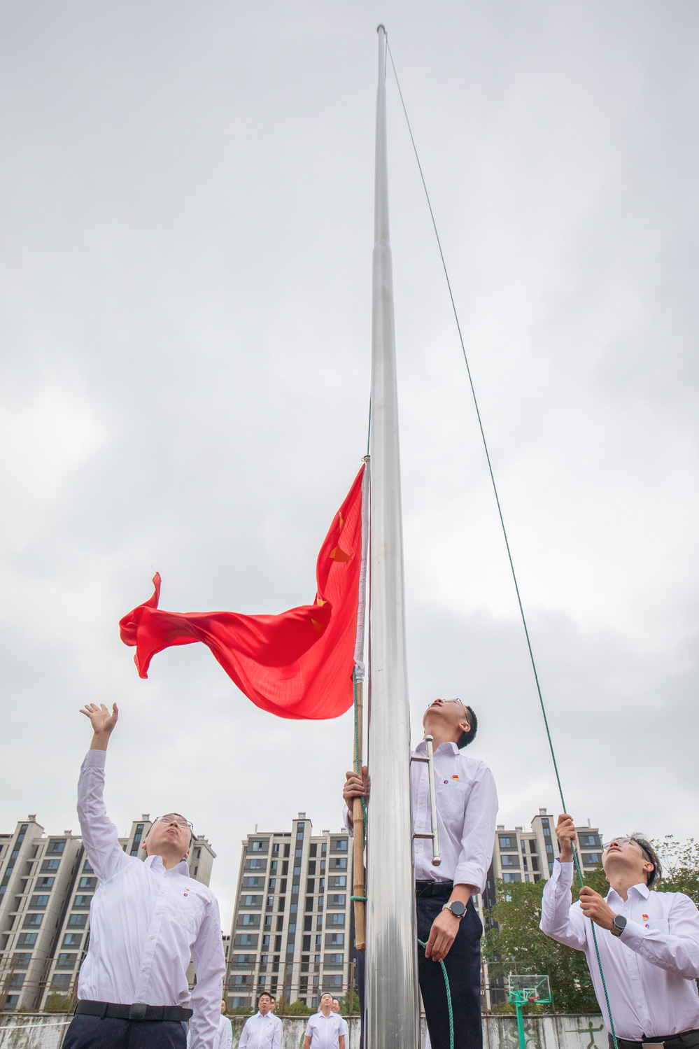 “升旗儀式現(xiàn)在開始,請(qǐng)全體肅立,唱中華人民共和國國歌”。上午8時(shí),伴隨著高亢激昂、嘹亮莊嚴(yán)的《義勇軍進(jìn)行曲》,旗手將國旗展向天空,全體人員懷著崇高的敬意和無比自豪的心情向五星紅旗行注目禮,鮮艷的五星紅旗冉冉升起、迎風(fēng)飄揚(yáng)。國旗下全體人員發(fā)出了“強(qiáng)國有我、強(qiáng)企有我”的鏗鏘誓言,奏響了“向光而行、逐夢(mèng)未來”的時(shí)代最強(qiáng)音。