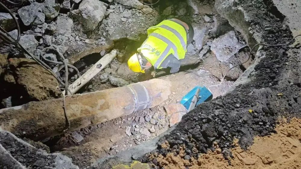 初冬季節(jié),此時晚上室外氣溫在5度左右。挖掘好深達2米的深坑后,工作人員開始實施堵漏。這次漏損點是鋼管變形造成焊縫斷裂達5厘米,由于地下管線異常復(fù)雜,有強電纜、還有弱電電纜交叉,有些地方搶修人員只能用鐵鍬或徒手清理出管道維修口。損壞管道清理出來后,發(fā)現(xiàn)只能用焊接修復(fù)的方法進行維修,再次增加了搶修的難度及時長,但搶修人員沒有后退,穩(wěn)扎穩(wěn)打,立即進行切割、補縫焊接,最終經(jīng)過6個小時的不懈努力,受損管道于夜里11點之前成功修復(fù),供水恢復(fù)正常。