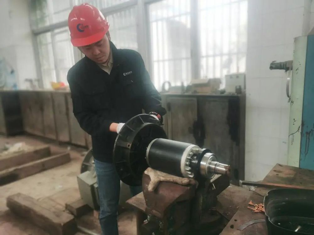 拆卸過程中,技術人員面臨安裝位置狹窄、操作空間有限等問題,但他們毫不退縮,憑借精湛技術及頑強毅力,順利完成故障電機拆卸工作。故障電機運抵修理車間后,技術人員爭分奪秒更換新軸承,并連續(xù)奮戰(zhàn)24小時完成維修,隨后對2號水泵葉輪等關鍵部件進行全面調(diào)試。最終,2號水泵恢復平穩(wěn)運轉,清澈水流重新輸送至文昌府居民家中。
