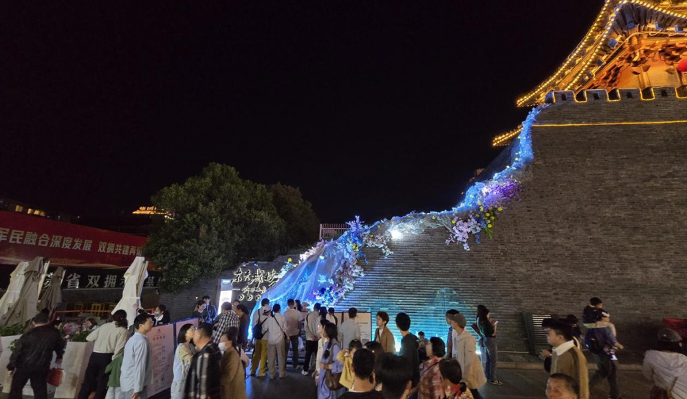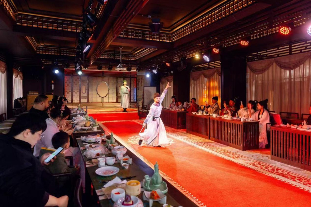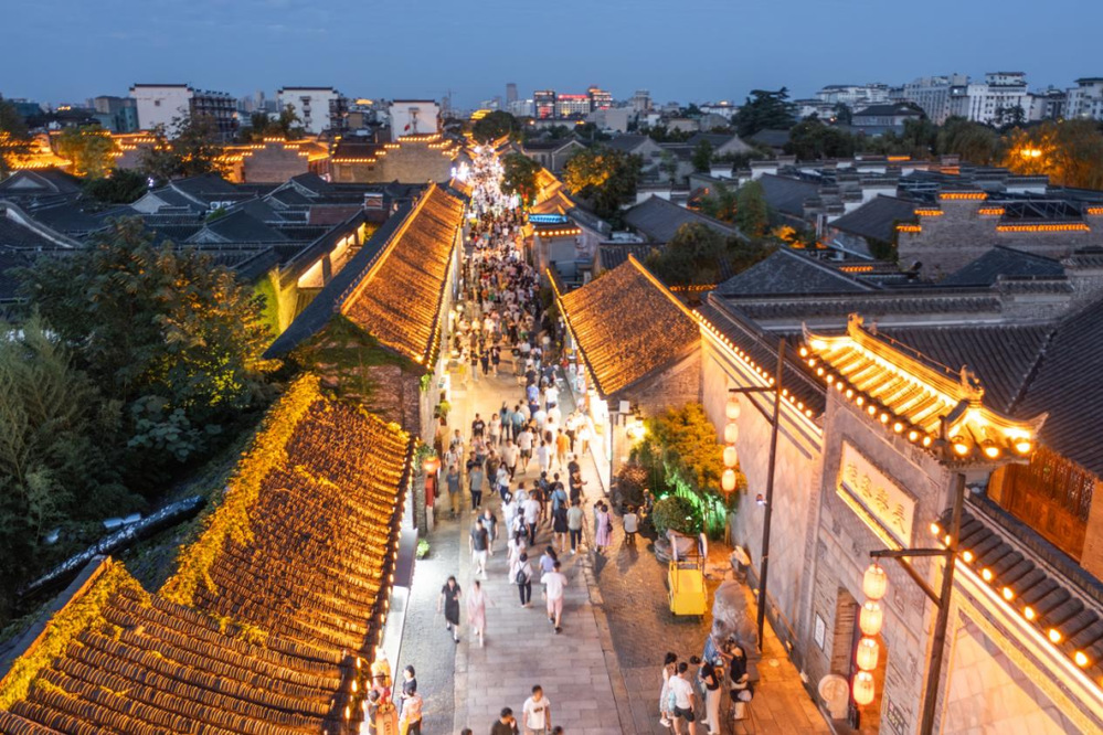 從謝馥春香粉店旁的“淮揚早茶體驗區(qū)”到街尾的“老字號美食長廊”,街區(qū)串聯(lián)起揚州美食文化精髓。三和四美醬園現(xiàn)場熬制“櫻花腐乳”,將傳統(tǒng)工藝與春日風物融合;揚大酸奶、漢森熊啤酒等網(wǎng)紅美食與霸王茶姬國風茶飲形成混搭風潮,滿足年輕群體的多元需求。夜經(jīng)濟版圖持續(xù)拓展:芍藥園子書場評話聲聲入耳,長樂鹽商宴再現(xiàn)鹽商雅集盛景,形成日賞非遺、夜享雅韻的全時段體驗閉環(huán)。數(shù)字科技為古街注入新活力,街區(qū)東門城樓引入VR全景漫游、AI互動等前沿技術,在東關城樓打造《創(chuàng)世·山海經(jīng)》沉浸式數(shù)字文化展,吸引約3000名游客穿越上古神話世界,虛實相生的光影藝術讓傳統(tǒng)文化煥發(fā)時尚魅力。