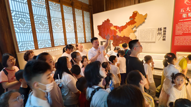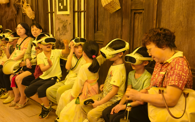 活動中,孩子們首先參觀了淮揚(yáng)菜博物館,深入了解淮揚(yáng)菜的歷史文化與精湛技藝。隨后,大家走進(jìn)“唐朝詭事錄”VR劇場,戴上VR眼鏡后,孩子們跟隨劇情線索穿梭于大唐盛景之中,在虛實(shí)交融的沉浸式體驗(yàn)里與古人展開“跨時空對話”?;顒游猜?,親子家庭相聚對影小酒館,共同動手制作傳統(tǒng)竹編扇,感受手工技藝蘊(yùn)含的匠心之美。