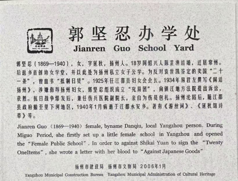 在晚清至民國(guó)風(fēng)雨飄搖的歲月里,揚(yáng)州廣儲(chǔ)門(mén)街32號(hào)的一幢民國(guó)建筑靜靜矗立,這里曾是郭堅(jiān)忍創(chuàng)辦私立女子公學(xué)的所在。這位出身詩(shī)書(shū)世家的才女,以教育為刃、以革命為志,在封建桎梏與民族危亡的夾縫中,書(shū)寫(xiě)了一段覺(jué)醒女性的傳奇。