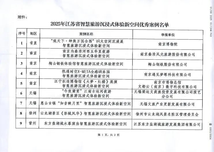 在近日江蘇省文化和旅游廳公布的《2025年江蘇省智慧旅游沉浸式體驗新空間優(yōu)秀案例名單》中,揚州《唐朝詭事錄·西行》國潮沉浸劇場與南京博物院“觀天下·坤輿萬國圖”VR大空間沉浸展等18個案例共同被評選為2025年江蘇省智慧旅游沉浸式體驗新空間優(yōu)秀案例。