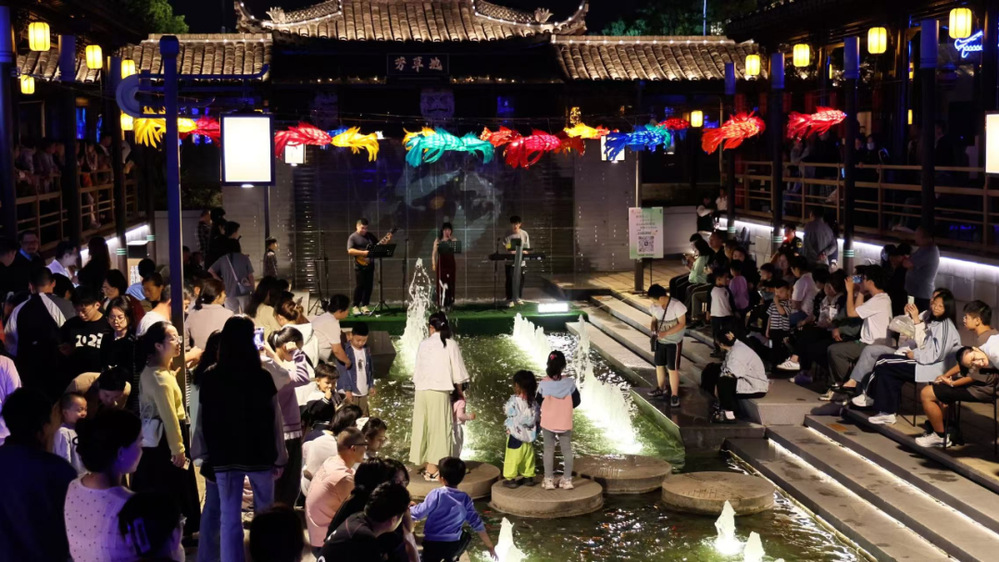 市集之上,音樂聲與歡笑聲交織回蕩。樂隊(duì)的精彩演繹中,動感旋律瞬間點(diǎn)燃觀眾熱情,不少市民、游客主動登臺獻(xiàn)唱,沉浸式享受熱鬧氛圍;古運(yùn)河邊軒窗輕啟,舞者于窗前水袖翻飛,不時與河邊游客互動,為喧鬧市集注入了鮮活靈動的氣息。