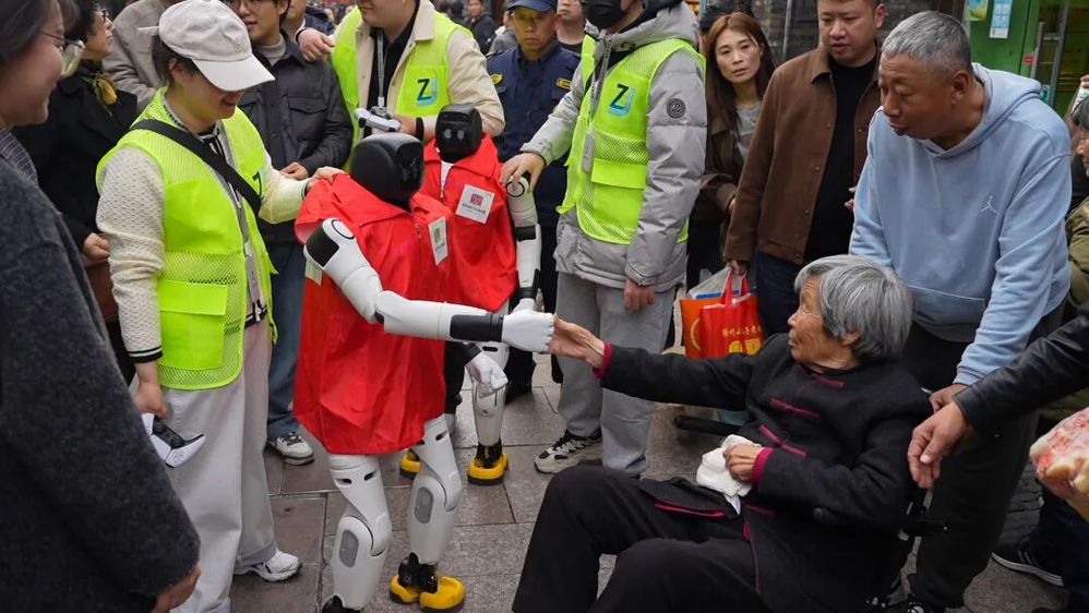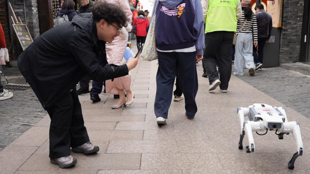 除了趣味表演,兩款機器人還承擔著智能引導(dǎo)職責。機器狗模擬動態(tài)巡邏姿態(tài),人形機器人則緩緩行走其間,為游客提供全方位的貼心服務(wù)。二者相輔相成,既讓游客感受到科技帶來的便捷與樂趣,也讓非遺文化、古街底蘊通過智能互動,更生動、更高效地傳遞給每一位游客。